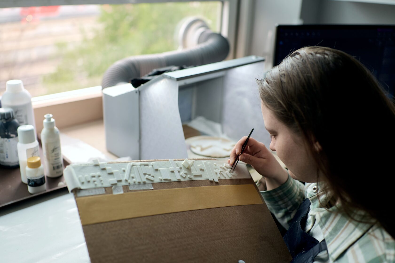 В мастерской Генпро макет воплощается в жизнь: линии превращаются в объемные формы, а мелкие детали складываются в целостные архитектурные композиции. Этот процесс демонстрирует тонкую работу с материалами, позволяя увидеть будущий облик города в миниатюре.